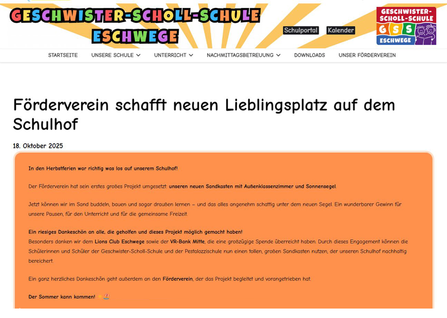 Heute durften wir als Lions-Club-Eschwege neben der VR-Bank Mitte der Geschwister-Scholl-Schule in Eschwege eine großzügige Spende überreichen. Wir freuen uns sehr, dass wir dieses mit weiteren Unterstützern möglich machen konnten. Nun können die Schülerinnen und Schüler sowohl der Geschwister-Scholl-Schule als auch der Pestalozzischule in der Zukunft in einem wunderbaren, großen Sandkasten mit Sonnensegel ihre Pausenzeiten und ihre Freizeit verbringen. Ganz herzlichen Dank an alle Organisatoren dieses tollen Projektes. Ganz besonderer Dank geht an den Förderverein der Schule, welcher dieses Projekt begleitet hat.